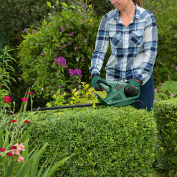 De heggenschaar EasyHedgeCut 55 van Bosch is gemakkelijk te hanteren door het lichte gewicht. Zo kunt u comfortabel werken in elke positie. Dankzij de hogesnelheidsmotor, de meslengte van 55 cm en de mesafstand van 16 mm levert de heggenschaar AHS 55 uitstekende prestaties. Het gereedschap is ideaal voor het snoeien van kleine heggen.