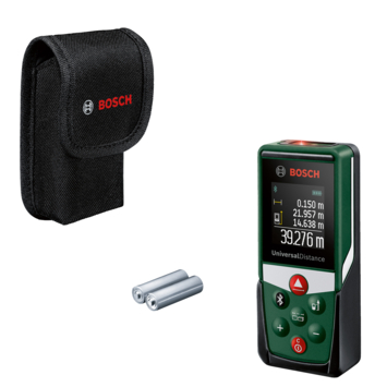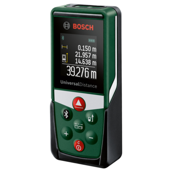 Met zijn laserstraal registreert de afstandsmeterUniversalDistance 40C afstanden tot wel 40 meter op twee millimeter nauwkeurig. Uit de gemeten lengtes berekent het toestel automatisch oppervlaktes en volumes. Wanneer u wilt weten hoeveel verf nodig is voor muren en plafonds of hoeveel stof nodig is voor gordijnen. De gemeten en berekende gegevens kunnen via de geïntegreerde Bluetooth-interface voor draadloze datatransfer overgebracht worden naar een gratis app van Bosch. Dat is een uitrustingskenmerk van de laserafstandsmeter zonder concurrentie. Met de app PLR „MeasureOn“, die zowel voor Android- als iOS-toestellen verkrijgbaar is, kan men de meetwaarden bijvoorbeeld in een tekening documenteren en op smartphone of tablet meenemen naar de bouwmarkt voor het kopen van de materialen. Of men stuurt de tekening in PDF-formaat per e-mail naar de schilder of vloerenlegger, dan weet ook hij precies wat hij aan materiaal mee moet brengen.