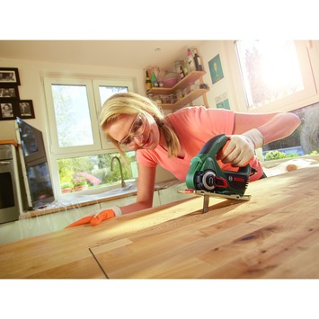 Het wisselen van de zaagbladen is zeer eenvoudig door de schuif te openen, het zaagblad te wisselen en deze weer te sluiten. Je hoeft het zaagblad niet aan te spannen en de ketting hoeft niet gesmeerd te worden. Daarnaast beschikt de microkettingzaag over stofafzuiging en stofblaasfunctie waardoor je altijd een goed zicht houd op de zaaglijn. Hiermee is de Bosch Easycut ideaal voor de doe-het-zelver.