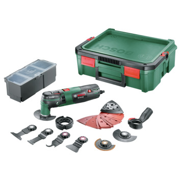 De Bosch multitool PMF 250 CES met SystemBox is een krachtige allrounder. De machine kan zelfs op lastig bereikbare plaatsen zagen, doorslijpen, schuren en krabben. Met de verschillende accessoires is de multitool veelzijdig inzetbaar en zeer geschikt voor precieze detailwerkzaamheden. Dankzij het Bosch AutoClic-systeem kunnen de opzetstukken eenvoudig zonder gereedschap worden verwisseld. De 250 watt motor met Constant Electronic technologie is voorzien van een traploze instelling van de oscillatiebewegingen. Hierdoor kan je rekenen op een gelijkblijvend hoog vermogen en op materiaal afgestemd werken. Een extra handgreep zorgt voor precisie en controle. De Bosch multitool wordt geleverd in een praktische SystemBox. De SystemBox is te stapelen en volledig flexibel in te richten. Door de hendel is de box ook moeiteloos te verplaatsen. In de SystemBox kunnen aparte bakjes worden geplaatst. Zo kan de box naar wens worden ingericht. De box is al voorzien van de eerste extra accessoires. In andere woorden: de Bosch multitool PMF 250 CES SystemBox is een complete startset voor elke klusser.