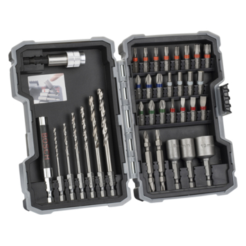 De Extra Hard-schroefbitset, 35 stuks, is een goede keuze voor universeel gebruik. Deze complete set bevat accessoires voor belangrijke boor- en schroeftaken. De schroefbits bestaan uit gemodificeerd S2-staal en zijn geoptimaliseerd warmtebehandeld. Dit maakt ze extra hard, waardoor ze bij alle taken goed presteren. Daarnaast vangt hun taps toelopende torsiezone de kracht en trillingen van maximale draaimomenten op. Dankzij hun kleurcodering zijn de bits snel te vinden. Bovendien bevat de set precisiegeslepen boren van HSS (high speed steel), voor snel boren in metaal en kunststof. Ze hebben een zeskantaansluiting van 1/4 inch voor schroevendraaiers en boor-/schroefmachines.