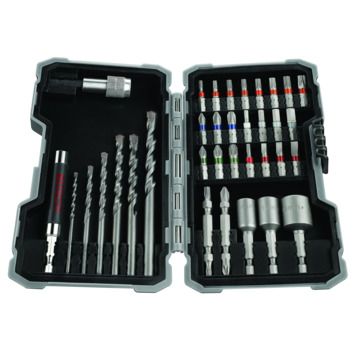 De Bosch 35-delige boren- en schroefbitset is een goede keuze voor universeel gebruik. De complete 35-delige set bevat accessoires voor allerlei boor- en schroeftaken. De schroefbits bestaan uit gemodificeerd S2-staal en zijn warmtebehandeld. Dit maakt ze extra hard waardoor ze bij alle klussen goed presteren. Dankzij de kleurcodering zijn de bits gemakkelijk te vinden. Ook bevat de set CYL-3-boren voor langdurig goede prestaties in harde materialen, bijvoorbeeld beton. De schroefbits hebben een zeskantschacht van 1/4 inch voor schroevendraaiers en boor-/schroefmachines. De boren hebben een cylindrische schacht voor alle gesnoerde of accu boorhamers.