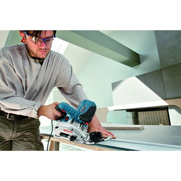 De Bosch Professional handcirkelzaag GKS 55+ g zaagt moeiteloos door hout en ander materiaal. De handcirkelzagen van Bosch zijn robuust en gaan lang mee. Hun krachtige motor zorgt voor een snel resultaat bij het dagelijkse werk op de bouwplaats. Betrouwbaar voeren ze hiermee zelfs de meeste veeleisende taken uit. Deze handcirkelzaag is een kleine compacte zaagmachine die uit een cirkelzaagblad bestaat die wordt aangedreven door een motor. Dit Bosch zaagblad heeft vlijmscherpe tanden. Kortom, kaarsrecht door hout, MDF en andere materialen zagen? Gebruik de Bosch Professional handcirkelzaag GKS 55+ g.