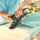 De Bosch multischuurmachine PSM 200 AES is een veelzijdige schuurmachine. Met zijn gewicht van 1,4kg ligt de machine licht in de hand. Uitgerust met een krachtige 200W motor is deze ook zonder problemen opgewassen tegen grotere klussen. Deze beschikt net als de kleinere Bosch PSM 100 A over een in tweeën verdeeld schuurplateau in de vorm van een strijkijzer: het achterste deel van het schuurplateau blijft in positie, de deltavormige punt is flexibel aangebracht en kan worden gedraaid. Daarnaast wordt voor nog meer flexibiliteit een vierhoekig schuurplateau meegeleverd. Hiermee kunnen ook grotere oppervlakken efficiënt worden geschuurd. Het wisselen van de schuurplateaus gebeurt zonder gebruik van gereedschap. Daaraan hecht het schuurpapier dankzij microklithechting zeer goed. Voor stofarm werken zorgt de meegeleverde microfilterbox. Als alternatief kan je op de aanwezige afzuigaansluiting ook een externe stofzuiger aansluiten.
