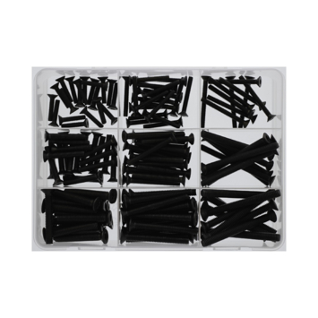 Complete set van 150 zwarte RVS 316 (A4) verzonken torx-bouten volgens ISO 14581. Maten M4 t/m M6, met Torx. Corrosiebestendig en ideaal voor strakke, vlakke montage. Geschikt voor buiten- en maritiem gebruik. Onderdeel van de exclusieve Black Edition lijn, Geschikt voor professionals die op zoek zijn naar kwaliteit én uitstraling.