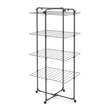 Bespaar ruimte en energie met het Brabantia HangOn droogtoren met wieltjes. Deze slimme droogtoren biedt 30 meter droogruimte verdeeld over vier inklapbare rekken op verschillende hoogtes, perfect voor lange was zoals broeken en handdoeken. De lijnen hangen ruim uit elkaar, zodat je was sneller droogt. Dankzij vier stevige wielen verplaats je de toren makkelijk, zelfs wanneer hij vol hangt. Voor een kleine was klap je het frame half uit en droog je aan één kant. Extra haken en houders bieden plek voor kleerhangers en kleine items. Na gebruik vouw je het rek compact in. Transportvergrendelingen houden alles netjes bij elkaar en dienen ook als ophanghaken. Gemaakt van 38% gerecycled materiaal en 96% recyclebaar na gebruik.
