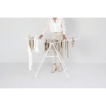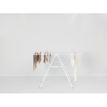 Bespaar tijd en energie door je was natuurlijk te drogen - en bespaar ruimte door het met dit slimme rek te doen! Dit Brabantia HangOn Droogrek heeft 20 meter droogruimte en haken voor 6 kleerhangers. Zo kun je dus overal in huis je broeken hangend drogen of je delicate kledingstukken plat drogen. Alles droog? Klap hem in en berg 'm op. De beste hangplek voor je was! - Kan bijna twee wassen aan - 20 meter droogruimte. - Voor groot en klein wasgoed - in hoogte verstelbare vleugels. - Ruimtebesparend - ingeklapt heel compact en makkelijk op te zetten. - Perfect voor blouses en overhemden - met 6 haken voor kleerhangers. - Makkelijk te verplaatsen, ook met was - met transportvergrendeling. - Geen verrassingen - kinderslot voorkomt per ongeluk inklappen. - Geschikt voor het (plat) drogen van fijne was - met droogplateau. - Minder kans op beschadiging van de vloer - robuuste beschermkappen. - Probleemloos gebruik - 5 jaar Brabantia garantie en service. - Milieuvriendelijk - Cradle-to-Cradle®-gecertificeerd, niveau brons. - Ook goed voor de planeet - bespaar energie en help WeForest meer bomen te planten. - Duurzamere keuze - gemaakt van 37% gerecycled materiaal, 95% recyclebaar.