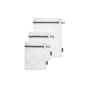 Bescherm je delicate kleding en je wasmachine met de Brabantia waszakjes. In deze set vind je twee kleine zakjes van 33 x 25 cm en één groot zakje van 45 x 33 cm, perfect voor het wassen, spoelen en centrifugeren van fijne was zoals lingerie of kleine kledingstukken. De sterke, fijnmazige stof voorkomt beschadigingen en houdt je wasgoed netjes bij elkaar. Dankzij de stevige ritssluiting met beschermd ritsslot blijven de zakjes goed dicht, zonder dat de rits je andere was of de trommel beschadigt. Zo blijft je kleding langer mooi en loopt je wasmachine geen risico. Praktisch, veilig en eenvoudig in gebruik.