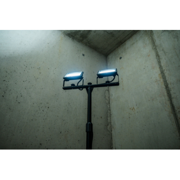 De JARO 6060 T LED werklamp op statief is een krachtige en energiezuinige bouwlamp met een vermogen van 2x20W. De robuuste aluminium behuizing met veiligheidsglas en de IP65-bescherming (stof- en straaldicht) maakt de lamp geschikt voor zowel binnen- als buiten. Het statief is in hoogte verstelbaar tot 1,8 meter en biedt een ideale bevestiging voor noodverlichting. De lamp met statief heeft drie stabiele stand buizen voor stabiliteit en een kabellengte van 3 meter. Dankzij de Everlight SMD LED’s heeft het een lange levensduur en daarnaast heeft het een speciale lichtverspreiding voor het verlichten van grote oppervlakten.