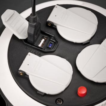 Comfort-Line kabelhaspel. Eenvoudig te gebruiken door de praktische draaibare ring. 3 geaarde contactdozen. 2 USB-laadcontactdozen, stof- en vuilafstotend. Laadstroom van max. 2100 mA, voor snel laadproces.