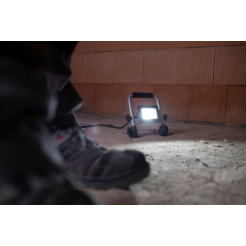 Mobiele LED- werklampEL 750 M, 9,9W, 900lm, IP65. Voor gebruik binnen- en buitenshuis. Solide, moderne aluminium behuizing. Ruimtebesparend door opvouwbaar frame. Stevig stalen buizenframe met kunststof beschermhoeken en ergonomisch gevormde schuimrubberen draaggreep. Spotlight traploos draaibaar en vergrendelbaar.