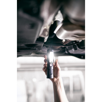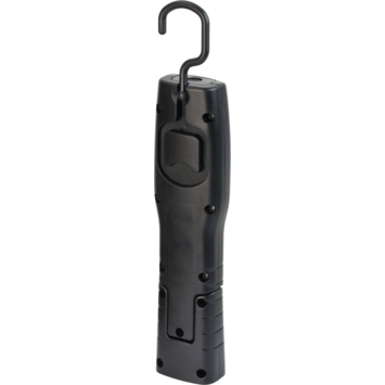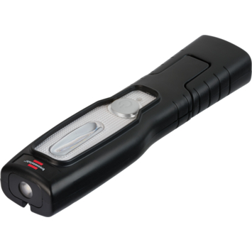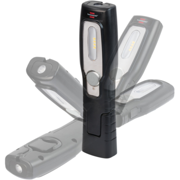De werklamp HL 201 A op accu is ideaal als handige en compacte lichtbron voor werkzaamheden in huis, in werkplaatsen of bij reparatiewerkzaamheden in de autobranche. Dankzij de geïntegreerde magneet en 360° draaibare, opvouwbare haak kan de buigbare handlamp flexibel worden bevestigd en zorgt deze altijd voor een perfecte verlichting op de werkplek. De heldere LED-zaklamp met oplaadbare batterij heeft 4 superheldere SMD LED's met een lichtduur tot 6 uur en een extra schakelniveau voor een SMD LED in de lampkop. De handlamp is uitgerust met een e oplaadbare Li-Ion batterij 3,7V/1000mAh met oplaadindicator - de oplaadtijd is ongeveer 2 uur.