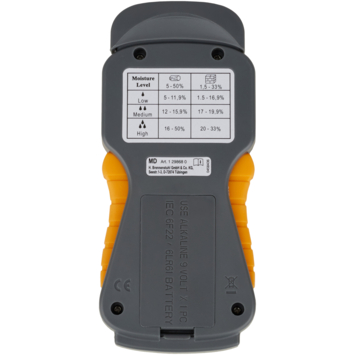 De vochtdetector MD overtuigt door zijn kwaliteit en veiligheid op alle gebieden. Hij maakt een snelle en eenvoudige bepaling van vocht op het oppervlak van verschillende materialen mogelijk en kan dankzij de praktische "hold"-functie ook op moeilijk toegankelijke plaatsen worden gebruikt. Het apparaat schakelt drie minuten na het laatste gebruik automatisch uit. De weergave gebeurt zowel op een groot LCD-scherm als akoestisch. De vochtdetector is ideaal voor zowel de doe-het-zelver als voor professioneel gebruik.