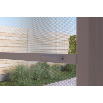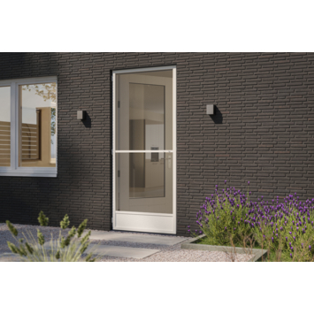 Het robuuste aluminium frame van 4 cm dikke profielen gecombineerd met een 20 cm hoge schopplaat biedt een stabiele en stevige constructie. De hordeur sluit stevig met een magneetsluiting en is voorzien van een geluiddempende borstel en sluitveer. Je kunt de hor zowel links als rechts op het kozijn monteren. Optioneel is een apart inbouwkader van Bruynzeel verkrijgbaar.
