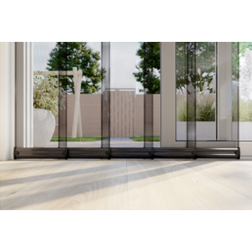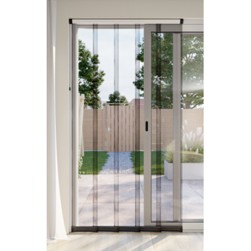 De Bruynzeel lamellenhor schuifpui S700 120x260 cm grijs is speciaal ontwikkeld voor brede doorgangen zoals schuifpuien. De hor bestaat uit vijf overlappende lamellen waar je moeiteloos doorheen loopt, ook wanneer je je handen vol hebt. Na het passeren vallen de lamellen automatisch weer terug, zodat insecten buiten blijven en frisse lucht vrij naar binnen kan. Door het ruimtebesparende ontwerp is er geen draairichting nodig.