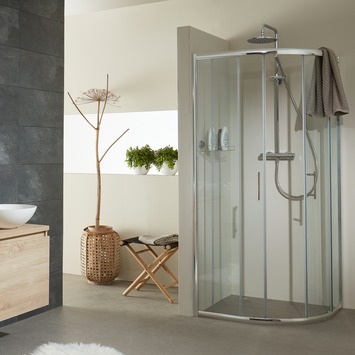 De Bruynzeel Lino kwartrond douchecabine 90x195 cm (radius 55) is geschikt voor montage in een hoekopstelling. Door zijn afmetingen in combinatie met schuifdeuren is deze cabine zeer geschikt voor het inrichten van een badkamer met beperkte ruimte. De twee schuifdeuren gaan soepel open en dicht dankzij de tandemrollers die los kunnen worden geklikt zodat de moeilijk bereikbare plekken makkelijk kunnen worden schoongemaakt. Deze kwartrond heeft een verstelbaarheid van 86,5 tot 88,5 cm. Je plaatst de douchecabine op een douchebak, dorpel of direct op de tegelvloer. .
