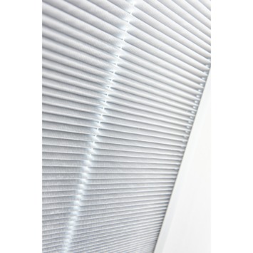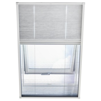 Voorzien van zwart geplisseerd gaas en wit geplisseerd verduisteringsdoek.