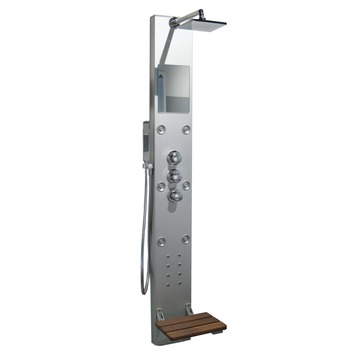 De Bruynzeel Solid Aluminium douchekolom is een fraai vormgegeven douchekolom. De douchekolom bestaat uit een hoofddouche, hydro rugjets en een handdouche. De drie mogelijkheden zijn onafhankelijk regelbaar. Als extra toevoeging heeft de Bruynzeel douchekolom een zitje. Tijdens het douchen kun je comfortabel zitten op het houten bankje.