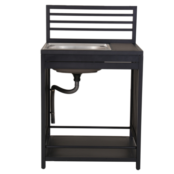 Deze tuinkeuken is gemaakt van robuust metaal en heeft een hoogte van 120 cm, een breedte van 74 cm en een diepte van 57 cm zodra hij uit de verpakking komt. Het ontwerp is strak en het antraciet geeft het een moderne uitstraling die bij vrijwel elke tuinstijl past. Deze tuinkeuken behoort tot onze vaste lijn en komt zonder wielen, wat zorgt voor extra stabiliteit tijdens het bereiden van je favoriete gerechten.