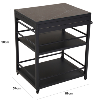 Deze buitenkeuken, vervaardigd uit robuust metaal, biedt een duurzaam en stevig kookstation voor al jouw buitenfeesten. Met een praktische hoogte van 90 cm en een breedte van 81 cm biedt hij voldoende werkoppervlak, terwijl de diepte van 57 cm ervoor zorgt dat de keuken niet te veel ruimte inneemt. De wielen zorgen voor gemakkelijke mobiliteit, zodat je het kookfeest overal naartoe kunt verplaatsen.