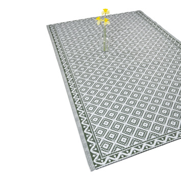 Buitenkleed Ibiza groen/wit 160x230cm geeft een gezellige sfeer aan jouw tuin, balkon of dakterras. Het kleed heeft een afmeting van 160 bij 230cm. Dit buitenkleed is UV-bestendig en gemaakt van polypropyleen waarvan 25% gerecycled polypropyleen. Daarnaast is het kleed zeer gemakkelijk schoon te maken en dus uitermate geschikt voor buiten.
