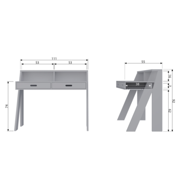De afmeting vanaf de onderzijde van het Connect bureau tot aan de grond is 62 cm, houd hier rekening mee bij het aanschaffen van een bureaustoel. Het werkblad bevindt zich op 75 cm hoogte. De vakken op het werkblad hebben een grootte van (hxbxd) 15.5x52.5x13.5.