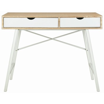 Een mooi bureau in een vintage uitstraling gemaakt van spaanplaat bekleedt met meubelfolie in de kleur eiken en gecombineerd met een wit gelakt stabiele metalen onderstel. Het bureaublad heeft de afmetingen (bxd): 100x48 cm. De werkhoogte is 76,5 cm. De 2 handige opbergladen, met spaanplaat fronten in het wit, zijn voorzien van solide metalen ladegeleiders. Het bureau wordt als bouwpakket geleverd en is makkelijk te monteren met behulp van de bijgeleverde montage instructie.
