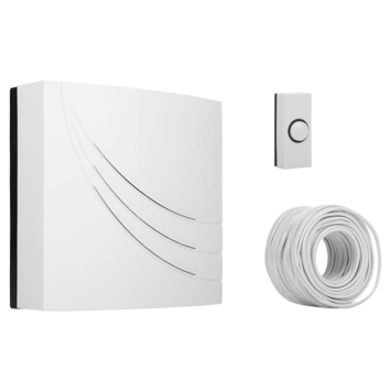 De bedrade deurbel set bestaat uit een beldrukker en een deurbel met een 8 melodieën. De deurbel dient bedraad (2-wire) aangesloten te worden. Werkt op een trafo (excl.) of 9v batterij (excl.). Inclusief 5m kabel (2-draads).