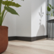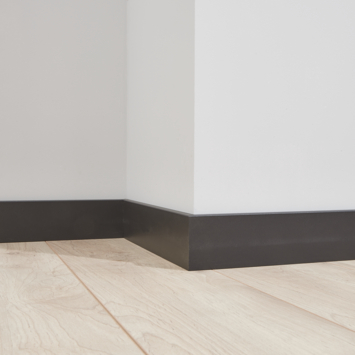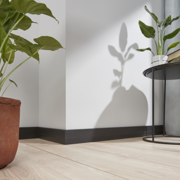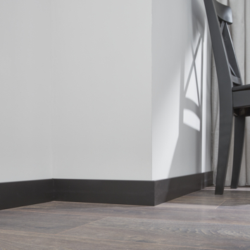 Prachtige hoge zwarte muurplint zeker in combinatie met de donkergrijze pvc click vloer allora