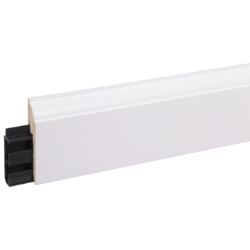 De CanDo muurplint kwart rond met kabelgoot wit 240 cm is een hoge, witte plint. De plint is voorzien van een kunststof strip waardoor meerdere kabels achter de plint onzichtbaar zijn weg te werken. De plint heeft een hoogte van 8 cm en een dikte van 1,9 cm. Deze plint wordt met schroeven bevestigd op de kabelgoot, waarna de plint hierop kan worden geplaatst. Werk de binnen- en buitenhoeken af met bijpassende hoekstukken. Gebruik voor het afwerken van de deurkozijn de speciale kozijnplint. Hoge witte plinten zijn verkrijgbaar in verschillende modellen die passen bij diverse interieurstijlen. De plinten zijn voorzien van wit folie dat overschilderbaar is zodat je deze kan voorzien van iedere gewenste kleur.