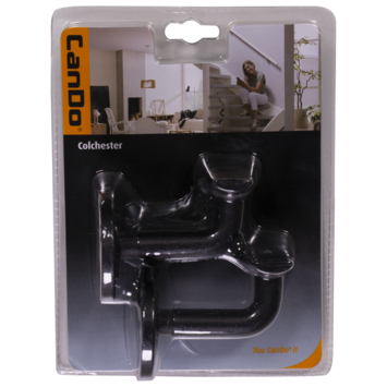 De CanDo trapleuninghouder Colchester mat-zwart (2 stuks) is een metalen leuninghouder in de kleur mat-zwart. Deze leuninghouder zit per 2 stuks verpakt in een blister, inclusief 6 bijpassende schroeven en pluggen voor montage aan de muur en 4 schroeven voor bevestiging aan de trapleuning. Na montage van de leuninghouder op de muur zijn de bevestigingsschroeven zichtbaar. Het product is geschikt voor gebruik binnenshuis in droge ruimten en kan worden toegepast op alle CanDo trapleuningen. Volg de aanwijzingen op de achterzijde van de verpakking van de gekozen leuninghouder voor een correcte en veilige installatie.
