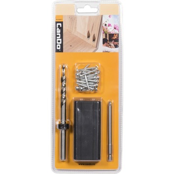 De CanDo schroefverbinder boorhulp is een handig hulpmiddel voor het verbinden van timmerpanelen. Deze startset bestaat uit een boormal, een boor, een bitje, 24 schroeven van 4x30mm. Je kunt hiermee de schroef netjes onder een hoek boren zodat je hem bijna niet meer ziet. Kortom de CanDo schroefverbinder is onmisbaar bij het maken van jouw eigen meubels.
