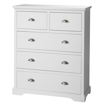 De ladekast Cannes uit de serie Provence heeft 5 laden. Elke lade is voorzien van solide metalen ladegeleiders. Het materiaal is van hoogwaardig MDF dat in de kleur wit is afgelakt. De lades zijn voorzien van metalen komgrepen. Deze ladekast, afmeting (hxbxd): 109x90x39 cm, is o.a. geschikt als opbergmeubel voor adminstratieve papieren en/of handig in de hal/ gang voor het opbergen van diverse accessoires zoals sjaals, handschoenen, sleutels en op de slaapkamer voor het opbergen van sokken, ondergoed. Een multifuctionele kast die overal geplaatst kan worden slaapkamer, kantoor, woonkamer en hal/gang.