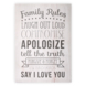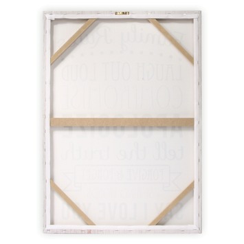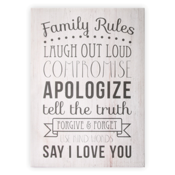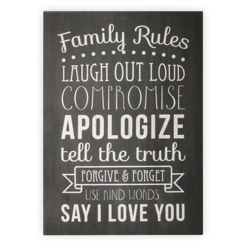 Canvas - Family rules 70 x 50 cm is een speels bord met regels voor het hele gezin. De vrije vertaling van de regels luidt: Hardop lachen, sluit compromissen, verontschuldig, vertel de waarheid, vergeef & vergeet, gebruik vriendelijke woorden en zeg ik hou van je. Door de zwart-grijs-wit tint past het canvasdoek vrijwel in ieder interieur op de muur. Het frame is 70 centimeter hoog en 50 centimeter breed.