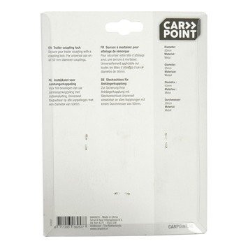 Het Carpoint koppeling slot beschermt je aanhangwagen tegen diefstallen. Het koppeling slot zorgt voor een solide beveiliging en laat je aanhangwagen niet door vreemde wegslepen. Het koppeling slot vult namelijk de insteeksluiting van je aanhangwagen waardoor deze niet meer aan een voertuig kan worden gekoppeld. Hierdoor kunnen dieven de wagen niet meer meenemen. Het slot is vanbuiten helemaal van staal waardoor die erg sterk is. Het slot is snel en gemakkelijk te bevestigen. Het wordt in de koppeling gemonteerd die daarna op slot wordt gedraaid waardoor meerdere pennen zorgen dat het slot in de koppeling blijft zitten. Het slot is geschikt voor alle standaard koppelingssystemen met een doorsnede van 50 mm. Het slot wordt geleverd met 2 sleutels.
