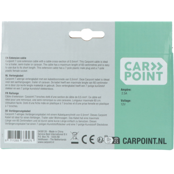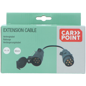 Carpoint 7 aderige trailer verlengkabel met een kabeldoorsnede van 0,5mm². Deze Carpoint kabel is ideaal voor een aanhangwagen, trailer of caravan. De kabel heeft een maximale lengte van 60 centimeter en is door zijn korte lengte makkelijk in gebruik. Deze verlengkabel heeft een 7 polige kunststof male stekker en een 7 polige kunststof female contrastekker of stekkerdoos.