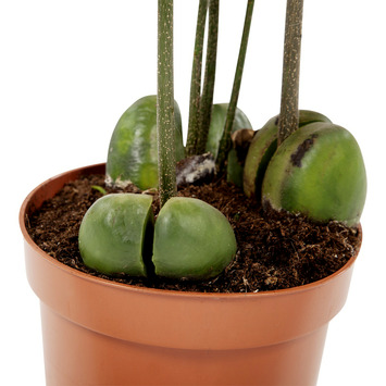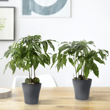 De Castano, oftewel de Australische kastanje, ontvang je per twee tegelijk. De planten hebben een hoogte van 30 centimeter met een potmaat van 12 centimeter doorsnede. En de naam verklapt het natuurlijk al. De Australische kastanje vindt zijn oorsprong in Australië. Daar groeit de Castano makkelijk uit tot meer dan twintig meter. In huis blijft de Castano gelukkig een stuk kleiner, tot maximaal een meter. Het is sterke kamerplant met glanzende bladeren. Maar wat de Castano vooral bijzonder maakt is de wijze van groeien. De Castano is een exotische kiemplant met bonen. Deze grote bonen zijn duidelijk zichtbaar in de pot. Dit maakt hem net een tikje anders.