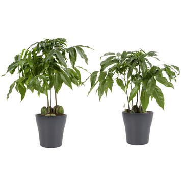 Set van twee Castano's in matgrijze bloempot. Beide potten bevatten meerdere planten. De planten hebben een hoogte van 30 centimeter gemiddeld met een potmaat van 12 centimeter. De Castano, ofwel de Australische kastanje, vindt zijn oorsprong in Australië. Daar groeit de Castano makkelijk uit tot meer dan twintig meter. In huis blijft de Castano gelukkig een stuk kleiner, tot maximaal een meter. Het is sterke kamerplant met glanzende bladeren. Maar wat de Castano vooral bijzonder maakt is de wijze van groeien. De Castano is een exotische kiemplant met bonen. Deze grote bonen zijn duidelijk zichtbaar in de pot. Dit maakt hem net een tikje anders.