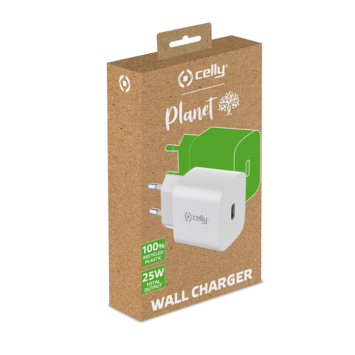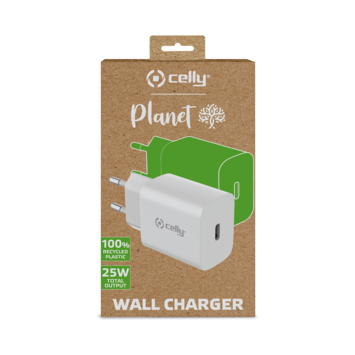 De nieuwe milieuvriendelijke thuislader van Celly met USB-C poort en een maximaal vermogen van 25 watt. De Celly Planet thuislader is de perfecte combinatie van bruikbaarheid en respect voor het milieu. De Celly muurlader is gemaakt van 100% gerecycled plastic en helpt zo je impact op het milieu te verminderen. Verminder je ecologische voetafdruk zonder aan kwaliteit in te boeten. Met een maximale output van 25Watt is deze lader met USB-C poort in staat om een breed scala aan apparaten snel en efficiënt op te laden, waaronder smartphones, tablets en andere elektronische gadgets. Het slimme ontwerp van de lader maakt hem compatibel met verschillende apparaten, ongeacht merk of model. Het wordt je universele metgezel bij het opladen. Compact en functioneel ontwerp: De thuislader is compact en elegant ontworpen en neemt zo min mogelijk ruimte in. Hij is perfect voor thuis, op kantoor of op reis. Waarom kiezen voor de Celly Planet thuislader? * Milieuvriendelijke thuislader gemaakt van 100% gerecycled plastic met 25Watt maximale output * Ingebouwde bescherming: Uitgerust met meerdere beveiligingen, zorgt onze lader voor de veiligheid van je apparaten tijdens het opladen. Maak je minder zorgen en geniet meer van het opladen. * Gebruiksvriendelijk: Sluit je apparaat aan op de lader, steek de stekker in het stopcontact en het opladen begint automatisch. * Draag bij aan duurzaamheid: Door voor onze milieuvriendelijke muurlader te kiezen, draag je actief bij aan het verminderen van vervuilend plastic en ondersteun je het milieu. * Compatibel met verschillende modellen smartphones en tablets: Apple, Samsung, Motorola, Xiaomi, OPPO, Huawei, TCL, Alcatel, Vivo, Realme.