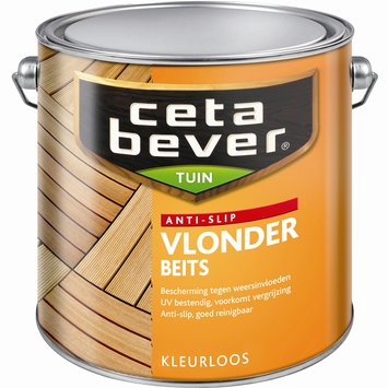 CetaBever antislip vlonderbeits teak 2,5 l is een transparante, zijdeglanzende, antislip houtbescherming voor buiten. Het is zeer geschikt voor toepassing op hard-, zacht- en geïmpregneerde houten vlonders maar ook op buitentrappen. De antislip werking van de vlonderbeits zorgt ervoor dat je ook bij natte weersomstandigheden veilig over de behandelde houten oppervlakken kunt lopen. Het heeft een sterk impregnerende werking waardoor het diep in het hout dringt en al het houtwerk in je tuin optimaal beschermt tegen het Hollandse klimaat. CetaBever antislip vlonderbeits teak 2,5 l beschermt het hout tegen UV straling en is goed reinigbaar waar het hout langdurig mooi blijft.