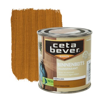 De CetaBever binnenbeits transparant zijdeglans licht eiken 250 ml is een zijdeglanzende, watergedragen binnenbeits in de kleur licht eiken voor al je houtwerk binnenshuis. CetaBever binnenbeits beschermt je hout tegen vlekken, vuil en krassen waardoor het langer mooi blijft. Je kunt het gebruiken op kaal of eerder transparant gebeitst hout zoals schroten, deuren, lambriseringen en meubels. CetaBever binnenbeits is sneldrogend en geurarm waardoor je het zonder problemen binnenshuis kunt verwerken. Het geeft je hout een prachtige transparante kleur waarbij het tegelijkertijd de houtnerf accentueert. Met CetaBever binnenbeits combineer je bescherming van je hout met een warme en natuurlijke sfeer.