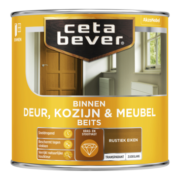 CetaBever Deur, Kozijn & Meubelbeits zijdeglans transparant rustiek eiken 250 ml is een watergedragen binnenbeits die je hout een natuurlijke uitstraling geeft. Het trekt in het hout en maakt het kras- en stootvast, terwijl het ook tegen vlekken beschermt. De zijdeglans afwerking laat de houtnerf mooi zien en geeft het hout een prachtige transparante kleur. Het is sneldrogend, zodat je snel verder kunt werken. Verkrijgbaar in diverse kleuren.