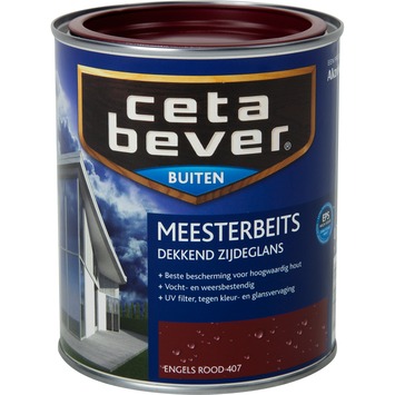 CetaBever Meesterbeits engels rood dekkend 750 ml is een zijdeglanzende, oplosmiddelarme, topkwaliteit beits voor buiten. Met dekkende CetaBever Meesterbeits bescherm je al het houtwerk aan je huis zoals deuren, kozijnen en luiken. Door de uitstekende hechting en hoge laagdikte bereik je met minder lagen een zeer duurzame bescherming. Dat betekent minder werk en toch jarenlange bescherming. CetaBever Meesterbeits bevat een UV-filter waardoor het houtwerk beschermd wordt tegen UV-straling en daardoor langer mooi en zijdeglanzend blijft. CetaBever Meesterbeits is vochtregulerend en duurzaam elastisch waardoor de beits de werking van het hout langdurig kan volgen. CetaBever Meesterbeits Dekkend is leverbaar in veel kleuren waardoor je houtwerk niet alleen duurzaam beschermt maar ook veel mooier wordt.