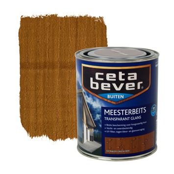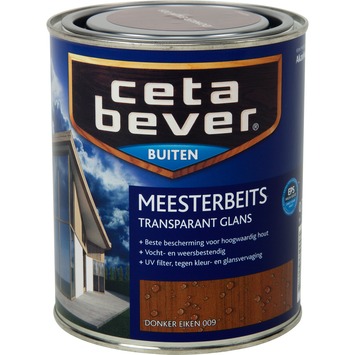 CetaBever Meesterbeits hoogglans donker eiken transparant 750 ml is een glanzende, oplosmiddelarme, topkwaliteit beits voor buiten. CetaBever Meesterbeits Transparant GL beschermt al het houtwerk aan je huis zoals deuren, kozijnen en luiken. Door de uitstekende hechting en hoge laagdikte bereik je met minder lagen een zeer duurzame bescherming. Dat betekent minder werk en toch jarenlange bescherming. CetaBever Meesterbeits Transparant GL bevat een UV-filter waardoor je houtwerk beschermd wordt tegen UV-straling en daardoor langer mooi en glanzend blijft. CetaBever Meesterbeits Transparant GL is vochtregulerend en duurzaam elastisch waardoor de beits de werking van het hout langdurig kan volgen. CetaBever Meesterbeits Transparant GL geeft je houtwerk een prachtige transparante kleur waardoor je bescherming van je hout met een natuurlijke uitstraling combineert.