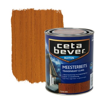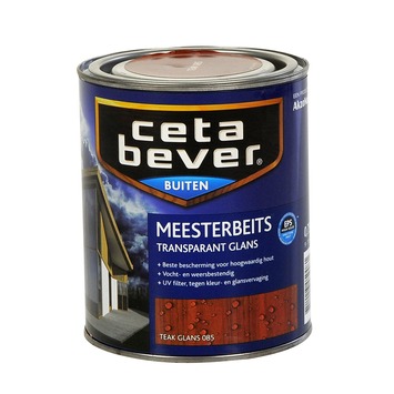 CetaBever Meesterbeits hoogglans teak transparant 750 ml is een glanzende, oplosmiddelarme, topkwaliteit beits voor buiten. CetaBever Meesterbeits Transparant GL beschermt al het houtwerk aan je huis zoals deuren, kozijnen en luiken. Door de uitstekende hechting en hoge laagdikte bereik je met minder lagen een zeer duurzame bescherming. Dat betekent minder werk en toch jarenlange bescherming. CetaBever Meesterbeits Transparant GL bevat een UV-filter waardoor je houtwerk beschermd wordt tegen UV-straling en daardoor langer mooi en glanzend blijft. CetaBever Meesterbeits Transparant GL is vochtregulerend en duurzaam elastisch waardoor de beits de werking van het hout langdurig kan volgen. CetaBever Meesterbeits Transparant GL geeft je houtwerk een prachtige transparante kleur waardoor je bescherming van je hout met een natuurlijke uitstraling combineert.
