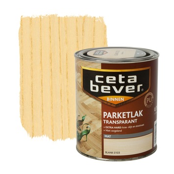De CetaBever parketlak mat blank 750 ml is een kleurloze, matte parketlak voor binnen. Het is een slijt-, stoot- en krasvaste parketlak die zeer geschikt is voor bescherming van je zacht- en hardhouten vloeren. CetaBever parketlak beschermt en verzorgt het hout en geeft je hout een prachtige kleurloze eindlaag waarbij de houtnerf zichtbaar blijft. Je kunt het ook toepassen op vloeren die eerder zijn afgewerkt met beits of lak. Het is geurarm en snel droog waardoor je de lak probleemloos binnenshuis kunt gebruiken. De CetaBever parketlak mat blank 750 ml is niet vergelend en goed reinigbaar waardoor je vloer lang mooi blijft.