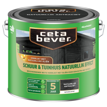 De CetaBever Schuur & Tuinhuisbeits Natuurlijk Effect mat antraciet is ideaal als je hout wilt beschermen én een natuurlijke uitstraling wilt behouden. Deze watergedragen beits biedt tot 5 jaar bescherming en zorgt al na 1 uur voor regen- en vochtbestendigheid. Het resultaat is een extreem matte finish die zwart opdroogt, perfect voor schuren, tuinhuizen en blokhutten. Geschikt voor alle houtsoorten, met het mooiste resultaat op onbehandeld nieuw hout. Deze beits is ook verkrijgbaar in zijdeglans, zowel in dekkende als transparante kleuren. Met een inhoud van 2,5 liter heb je genoeg voor middelgrote tot grote projecten.