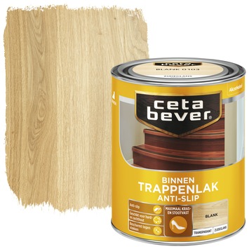 Cetabever trappenlak antislip transparant blank zijdeglans 750 ml is een watergedragen lak verkrijgbaar in mat, zijdeglans en zijdeglans anti-slip. Het beschermt en verzorgt uw hout en geeft uw hout een prachtige kleurloze eindlaag waarbij de houtnerf zichtbaar blijft. CetaBever trappenlak is ook verkrijgbaar als dekkende variant.