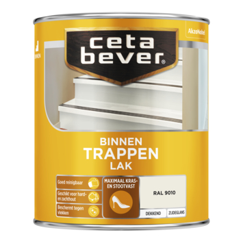 Cetabever trappenlak dekkend RAL 9010 gebroken wit zijdeglans 750 ml is een watergedragen lak verkrijgbaar in wit en RAL 9010. Het beschermt en verzorgt uw hout en geeft uw hout een prachtige dekkende eindlaag. CetaBever trappenlak is ook verkrijgbaar als transparante variant.