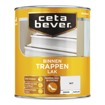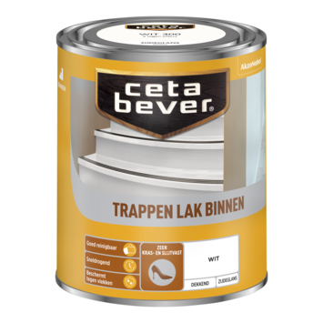 Cetabever trappenlak dekkend wit zijdeglans 750 ml is een watergedragen lak verkrijgbaar in wit en RAL 9010. Het beschermt en verzorgt uw hout en geeft uw hout een prachtige dekkende eindlaag. CetaBever trappenlak is ook verkrijgbaar als transparante variant.